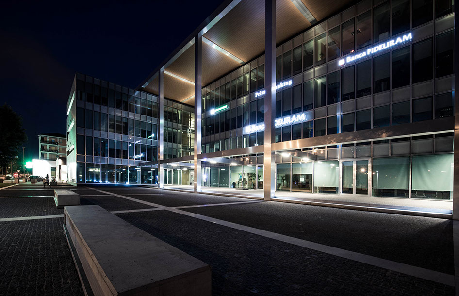 Si tratta di un edificio di tre piani fuori terra con un piano seminterrato al quale è stata data dignità di piano nobile attraverso la realizzazione di un giardino ribassato che garantisce illuminazione, aerazione, e vista alle sale riunioni e al centro congressi.