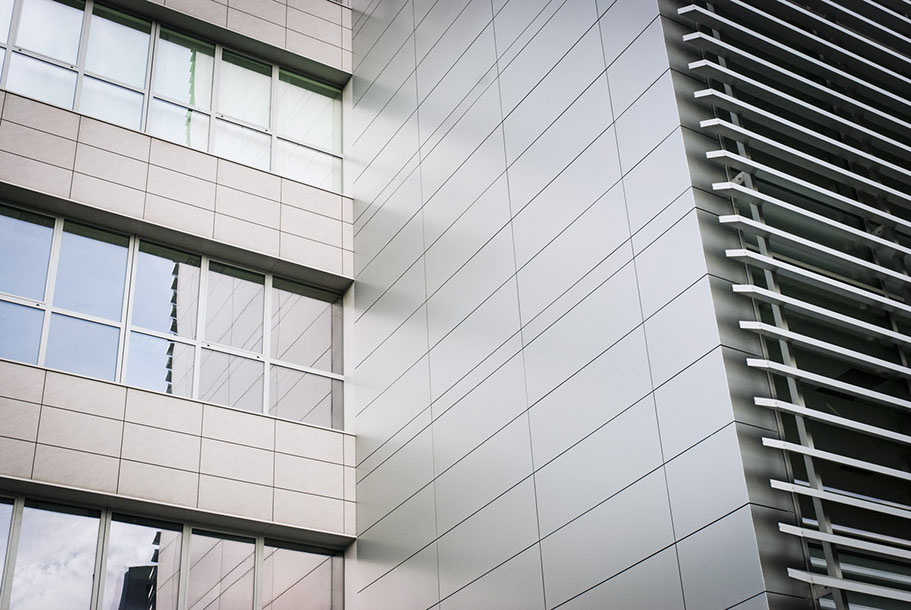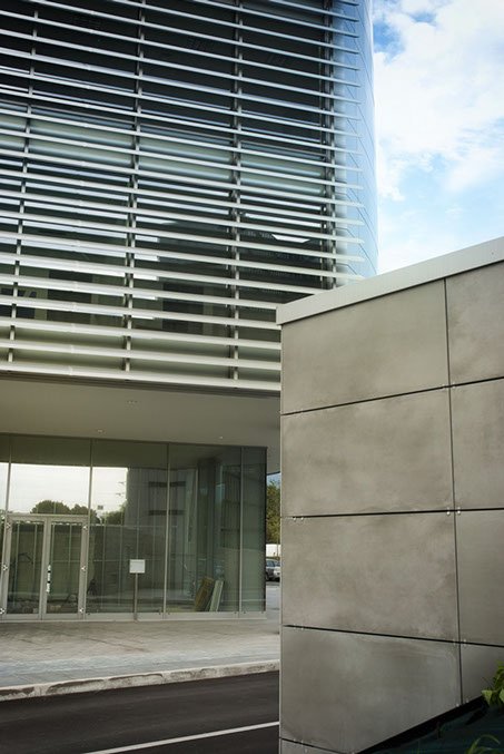 La definizione della nuova immagine del complesso direzionale si è basata anche sul progetto dettagliato degli elementi esterni: pavimentazioni e pensilina d'ingresso.