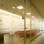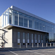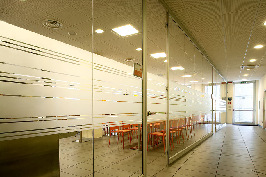 Al volume curvo in alluminio che ospita gli uffici dirigenziali si accosta un volume rigoroso in vetro dove si trovano le aree operative. Nonostante la rigida differenziazione in termini di immagine, internamente gli ambienti sono articolati in modo da garantire il collegamento visivo e consentire la percezione dell'intero organismo.