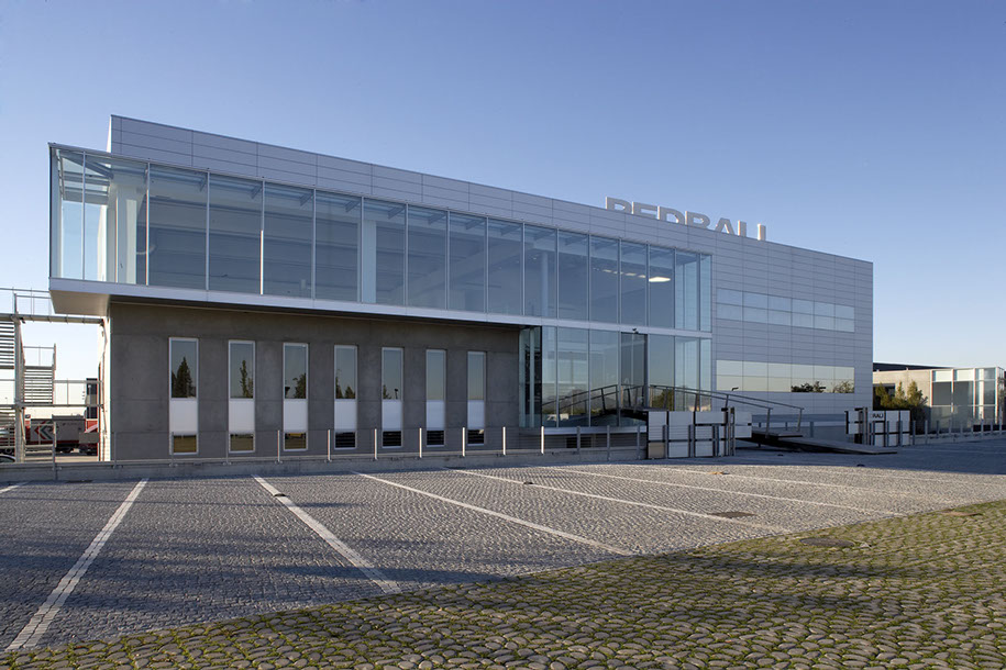 La sede della Pedrali s.p.a. è stata realizzata all'interno del nuovo insediamento che ospita le attività produttive dell'azienda. La palazzina uffici si sviluppa su tre livelli per complessivi 3.000 mq e comprende i servizi per i dipendenti (mensa e spogliatoi) la hall di ingresso e una zona espositiva.