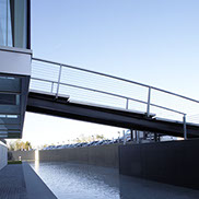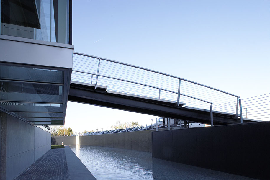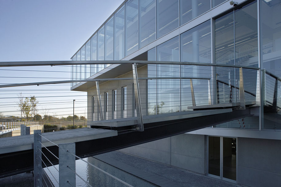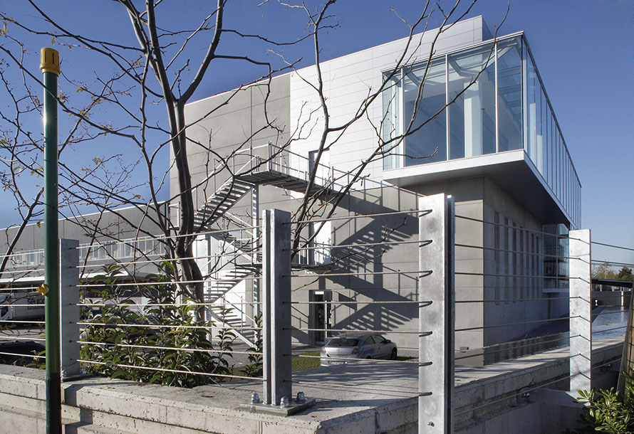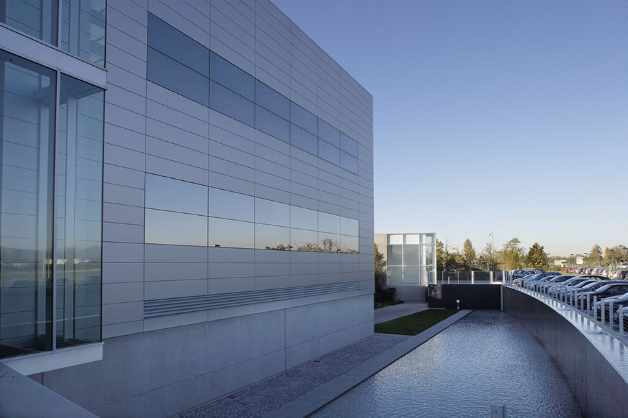 L'ingresso all'edificio avviene al primo piano attraverso una passerella metallica sospesa sopra un bacino d'acqua. Completano l'intervento l'edificio che ospita lo spaccio aziendale, la sistemazione delle aree esterne a parcheggio e verde, la vasca d'acqua con una cascata sul fronte principale della palazzina uffici.