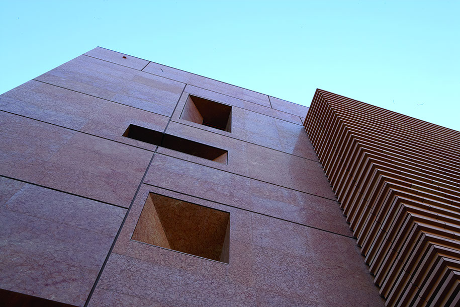 La nuova immagine dell'edificio riprende i materiali della tradizione locale presenti nella chiesa parrocchiale ed è fortemente caratterizzata dalla facciata ventilata, realizzata con lastre di grande formato in marmo rosso Asiago nella quale trovano inserimento frangisole realizzati con estrusi in cotto montati su struttura metallica.
