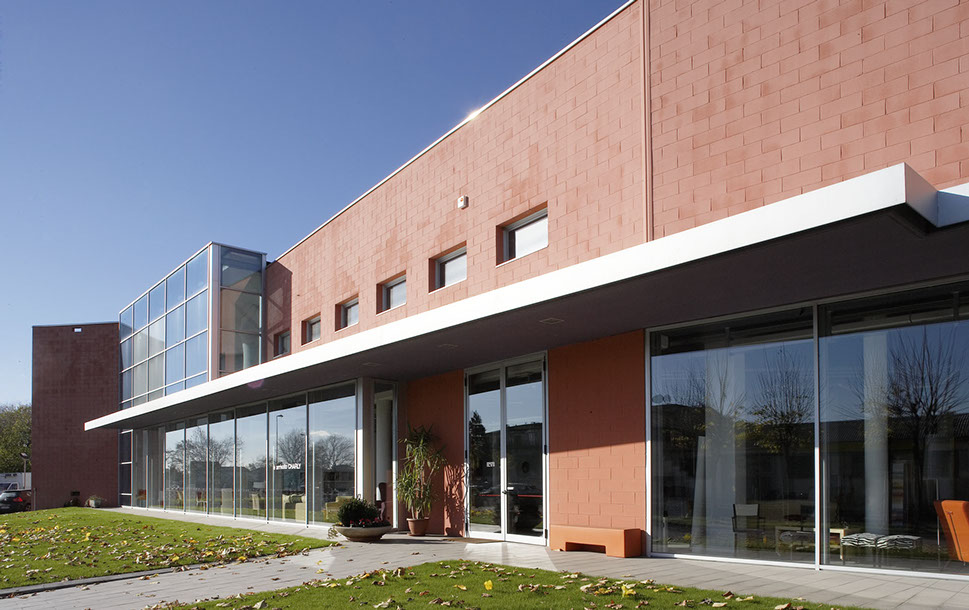 La nuova sede della società Mazzoli nasce dal riutilizzo di alcuni capannoni all'interno di una zona produttiva esistente.