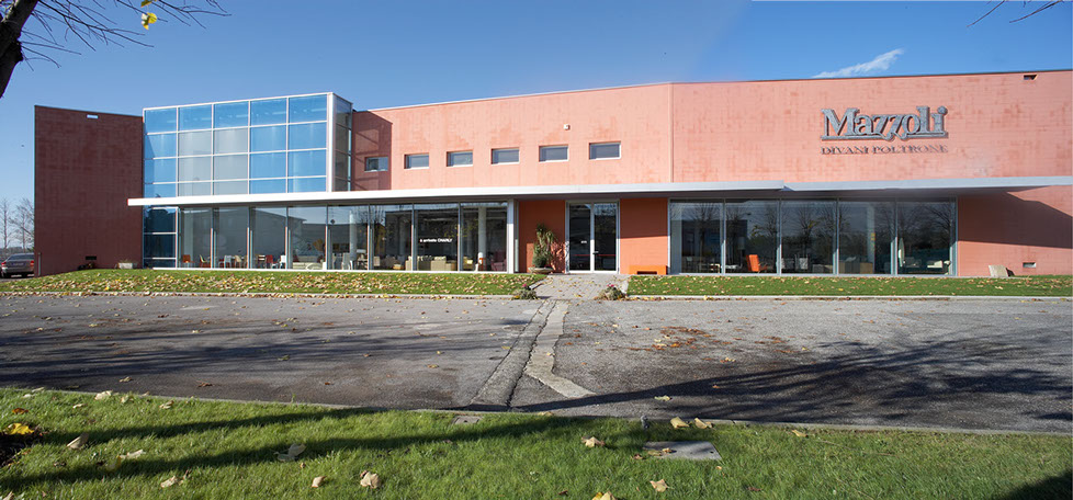 Il fronte principale è caratterizzato da una massa muraria di colore rosso, con andamento discontinuo, dal quale emergono il volume vetrato a doppia altezza dell'area espositiva e la pensilina in acciaio che protegge le vetrine. L'esposizione è un open space su doppio livello con impianti a vista e pavimento industriale dove trovano collocazione gli oggetti d'arredo prodotti dalla ditta.